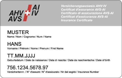 Toute personne assurée en Suisse doit être en possession d’un numéro de sécurité sociale comportant 13 chiffres. Le numéro AVS apparaît habituellement sur la carte d'assurance-maladie. Pour les personnes qui ne possèdent pas de carte d’assurance-maladie ou qui sont en possession d’une telle carte sans le numéro AVS, la Caisse de compensation peut établir un certificat d’assurance AVS. Celui-ci atteste votre inscription au Registre des assurés AVS/AI. Conservez-le soigneusement.