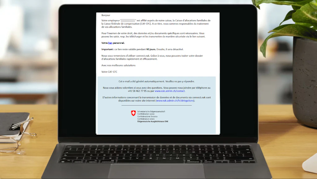 Les e-mails contenant le lien vers la tâche en question sont envoyés depuis l'adresse it.eak@zas.admin.ch. Il s'agit de l'adresse e-mail officielle du service informatique de la CFC.
