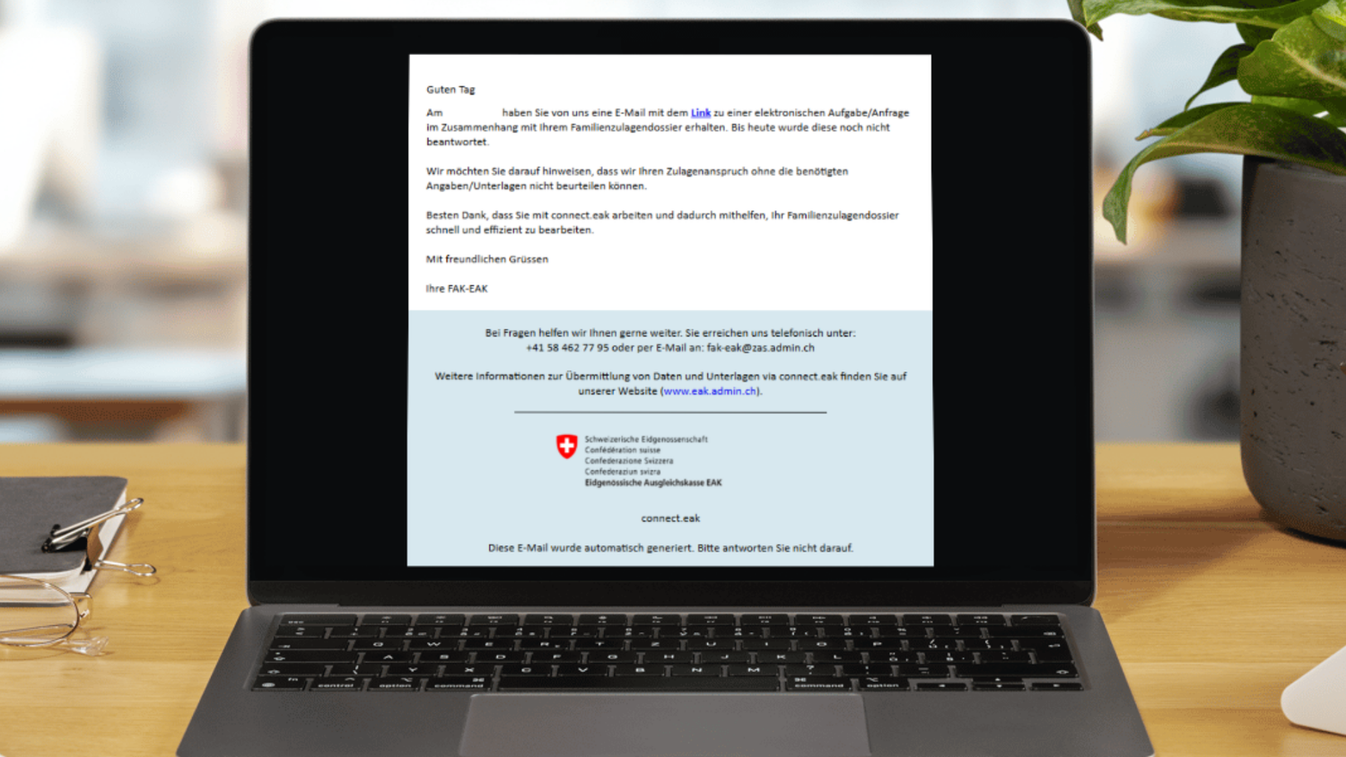 Saremo lieti di rispondere alle Sue domande sugli assegni familiari e su connect.eak. Può raggiungerci per telefono al +41 58 462 77 95 o per e-mail fak-eak@zas.admin.ch.